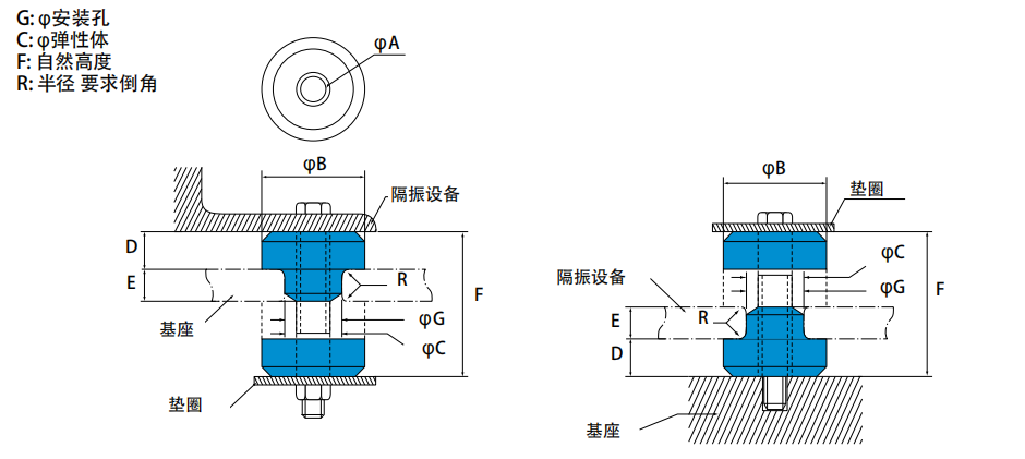 该系列隔振器包含两组件。一件和金属管硫化为一体;另一件为纯橡胶件。